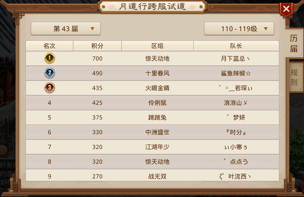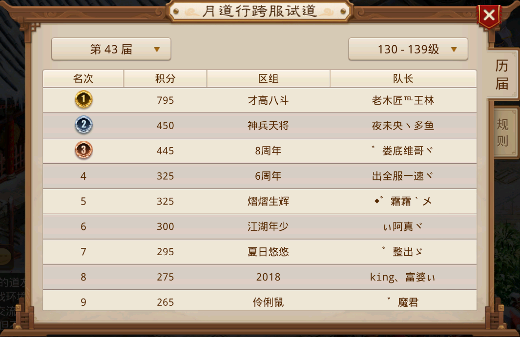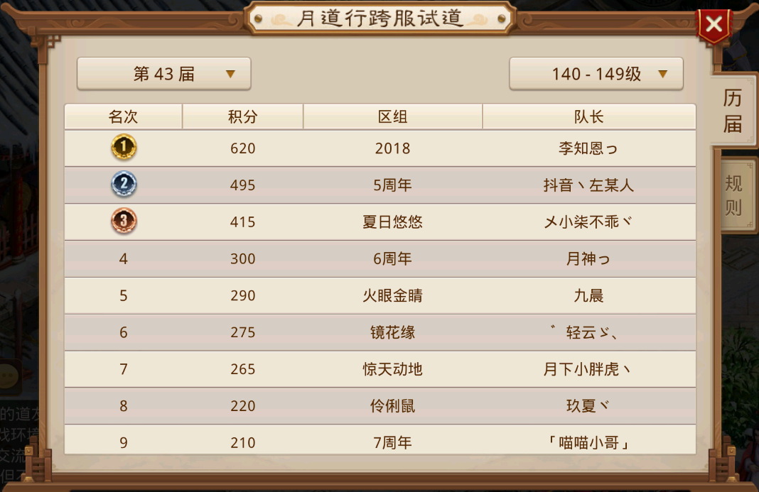 队伍成员的月道包揽排行前五,本届跨服并没有出现上一届那样难舍难分,以绝对的优势战胜战九幽区组的队伍,复仇成功,夺回了天下道尊。