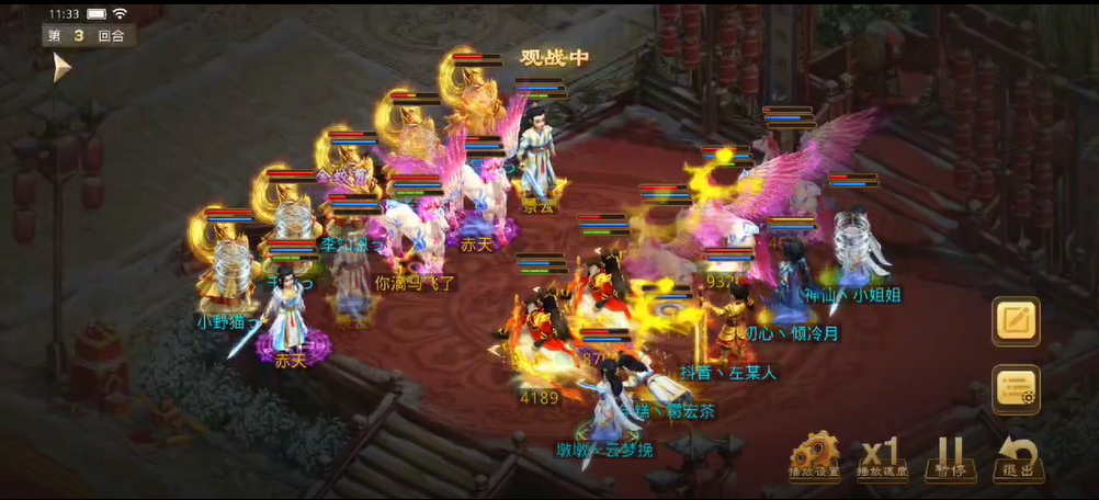 观战方敏火解除障碍后继续补速度,宠物用束手就擒限制对战方法金,也用闻风丧胆限制了对战方控火,对战方同样用宠物束手观战方法木,闻风观战方控火时失败,观战方控火出手只障碍上对战方的控火,对战方用宠物将力木打醒,出手将观战方敏火打倒并附上混乱状态,而敏火的宠物出现失误普攻了观战方(应该是时间到了没来得及操作)。